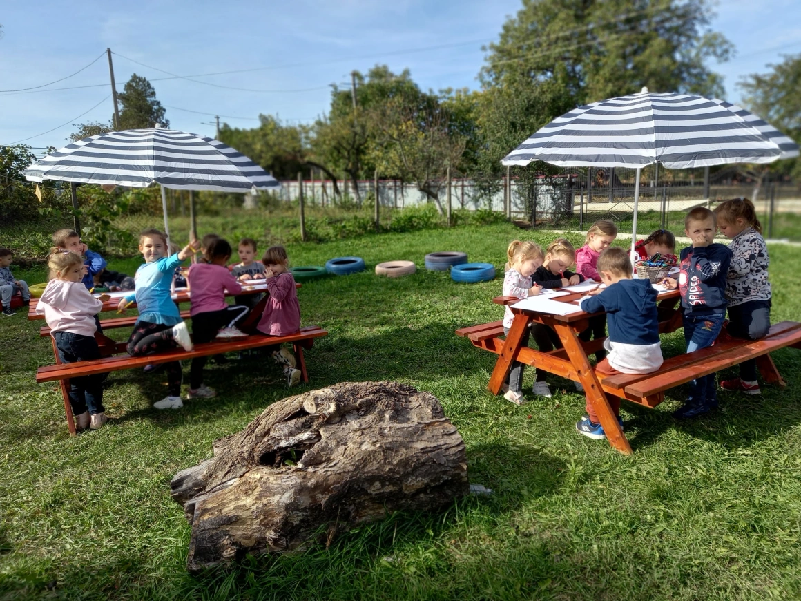 Activitățile în aer liber sunt o parte importantă pentru noi, deoarece copiii se simt liberi, pot investiga și pot interacționa cu elementele din natură atât de familiare lor. De aceea, pe lângă cele desfășurate în curte, am planificat și câteva de explorare a naturii mai îndepărtate. Toamna aceasta am fost la cules ciuperci, ocazie potrivită pentru a observa pădurea toamna, pentru a recunoaște arbori, plante și ciuperci de pădure. Urmează să plantăm arbuști și puieți de copaci la limita terenului amenajat, astfel acumulând cunoștințe despre ciclul de viață al plantelor și despre rolul oamenilor în protejarea naturii. Vom avea și activități de cules plante medicinale de pe dealurile din jurul satului nostru, oportunitate potrivită pentru a discuta despre rolul plantelor în menținerea sănătății.