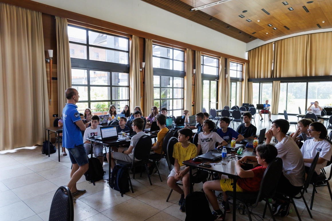 Într-o sală înaltă și luminoasă de la un centru de evenimente din Snagov, în pantaloni scurți și tricou, Cristian Frâncu le explică celor trei mese de elevi și eleve despre numerele raționale și iraționale.