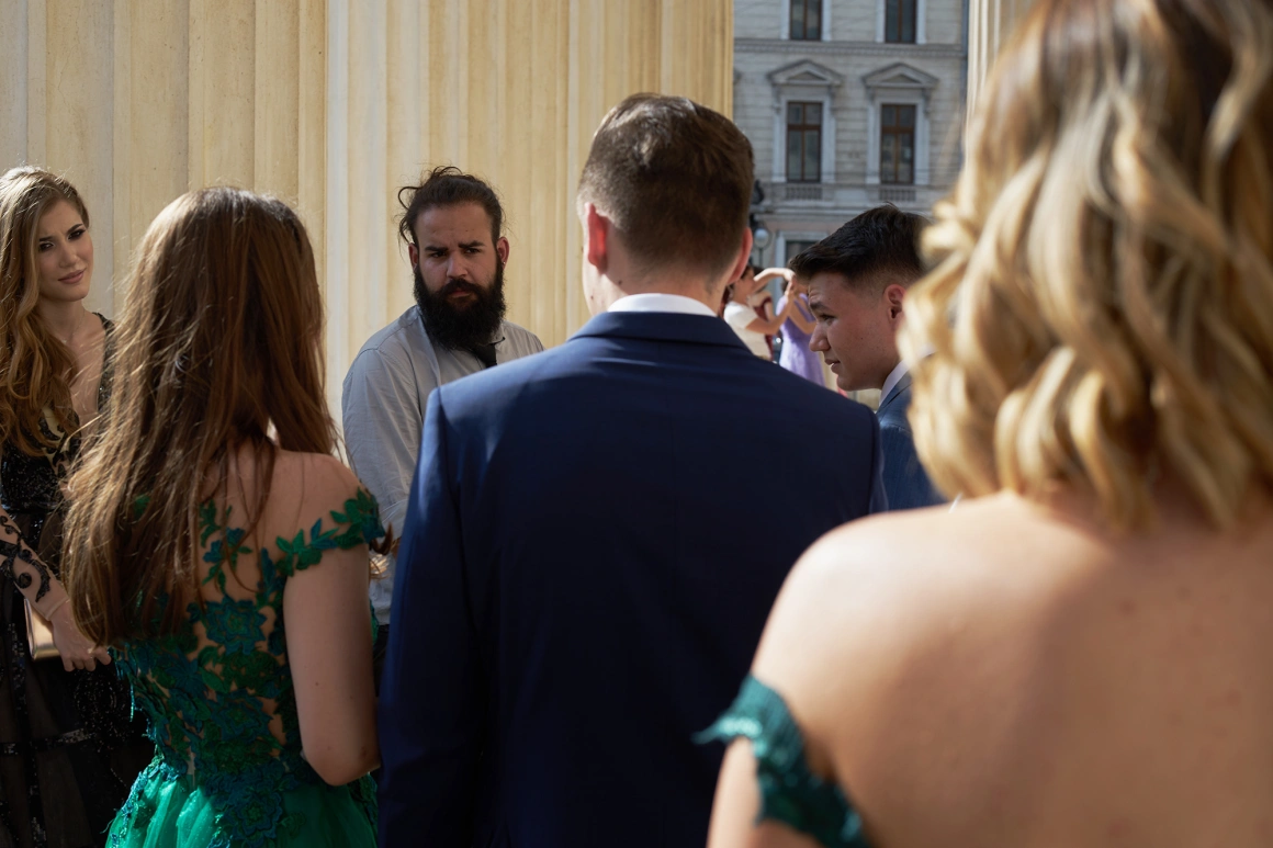 După o oră și jumătate, liceenii încep să nu mai aibă răbdare. Tocurile nu mai au spor pe piatra cubică din fața Ateneului, un băiat nu mai suportă cămașa somon și se descotorosește de ea la colț de clădire, lângă câteva colege care-și fac selfie-uri pentru Insta Stories. Un licean întreabă dacă cineva mai „are baterie la baterie”. O fată sună la șoferul de limuzină să-l roage să vină cu o jumătate de oră mai târziu și să nu-i taxeze din timpul lor, că ei mai au de stat la ședință. Un coleg spune că ar fi fost mult mai cool să închiriez un Party Bus, cum a auzit el la alte licee. O altă absolventă îi spune mamei la telefon că încă sunt la Ateneu și o colegă strigă spre ea: „Spune-i că a făcut o fată foarte frumoasăăă!” O altă mamă care și-a condus fiica la ședință îi amintește că adidașii sunt în geantă.