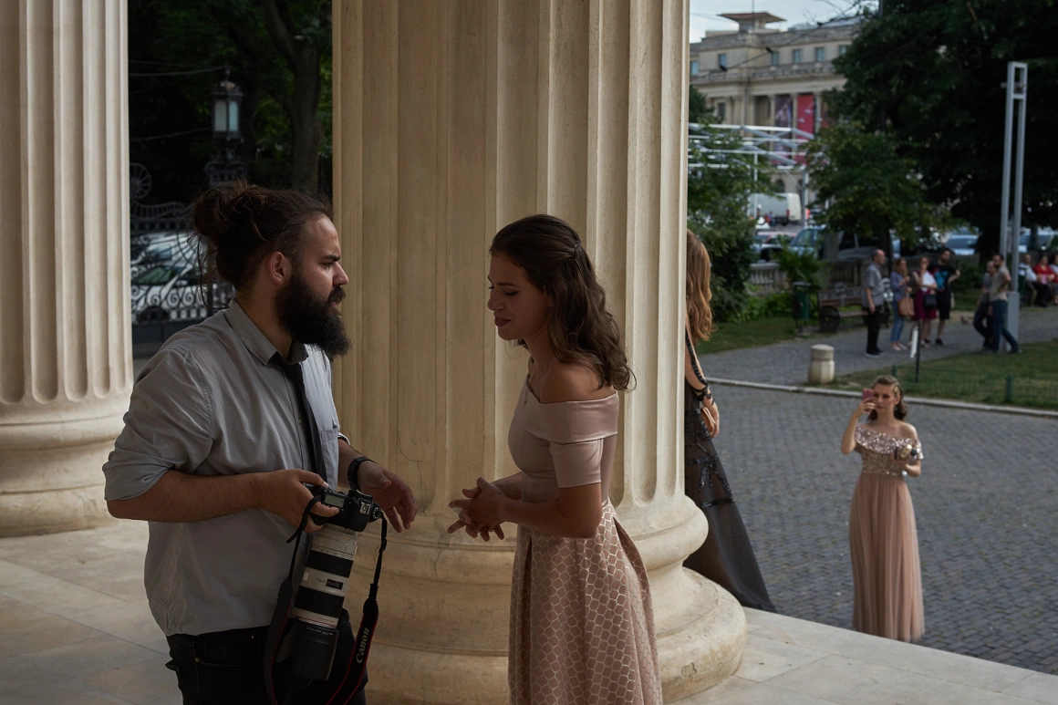Andrei lucrează mai eficient cu multe dintre fete. Pentru că parte din ele au mai fost la ședințe foto, chit că asta a însemnat o după-amiază într-un parc în care o prietenă le-a surprins cu un smartphone. Își știu profilul mai bun, știu cum să stea să nu iasă cu gușă. Unele vor să iasă ca într-un pictorial Vogue și Andrei le mai spune ce picior să scoată în față, altele sunt mai serioase și le pozează mai „corporate”. Băieții nu știu de multe ori cum să stea. Andrei îl conduce pe unul dintre cei șapte băieți de la a XII-a C pas cu pas, din spatele obiectivului: „Uită-te la ceas și când îți spun ridici privirea spre mine”. „Deschide ultimul nasture de la sacou”. „Lipește limba de cerul gurii”. „Perfect.”