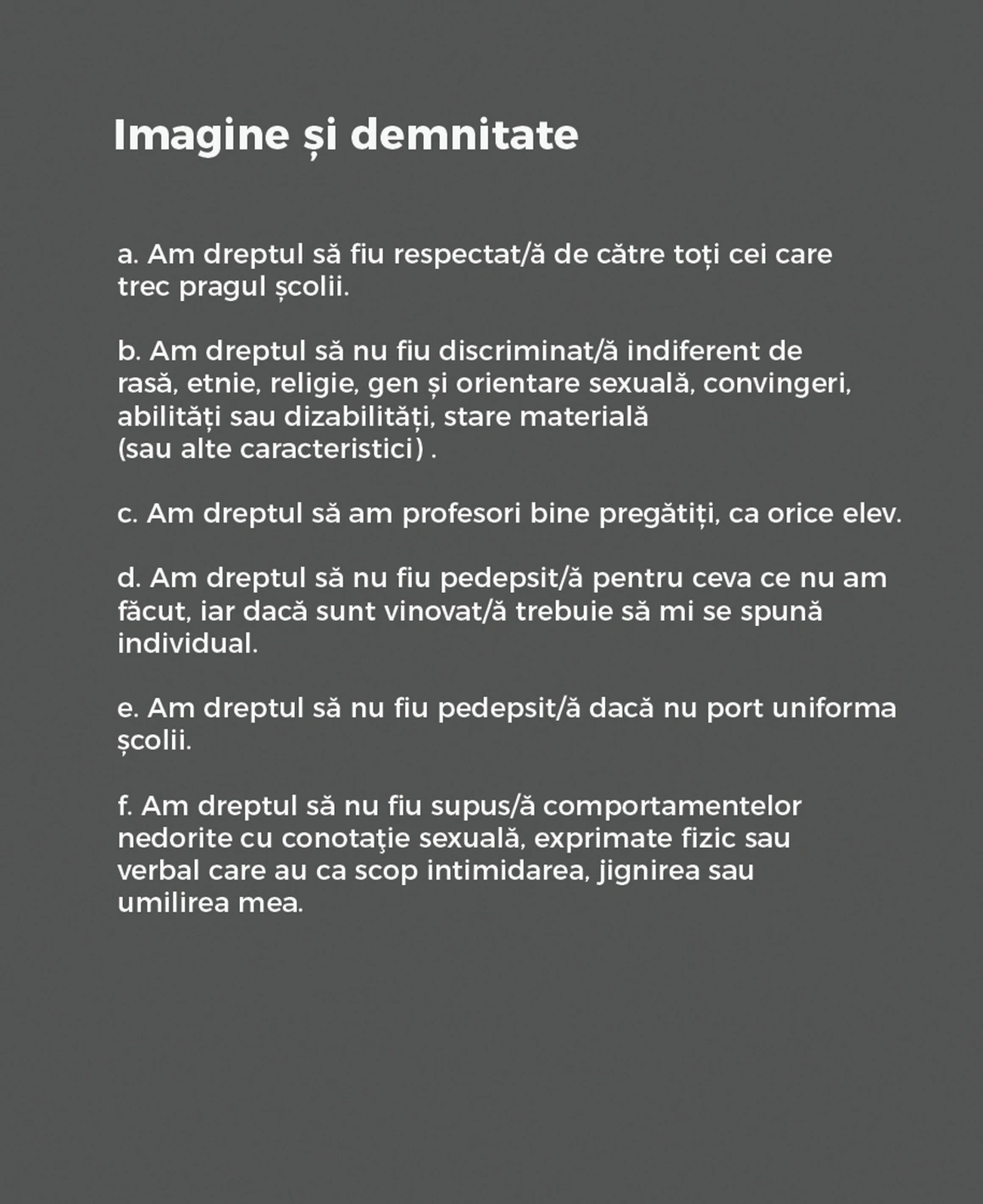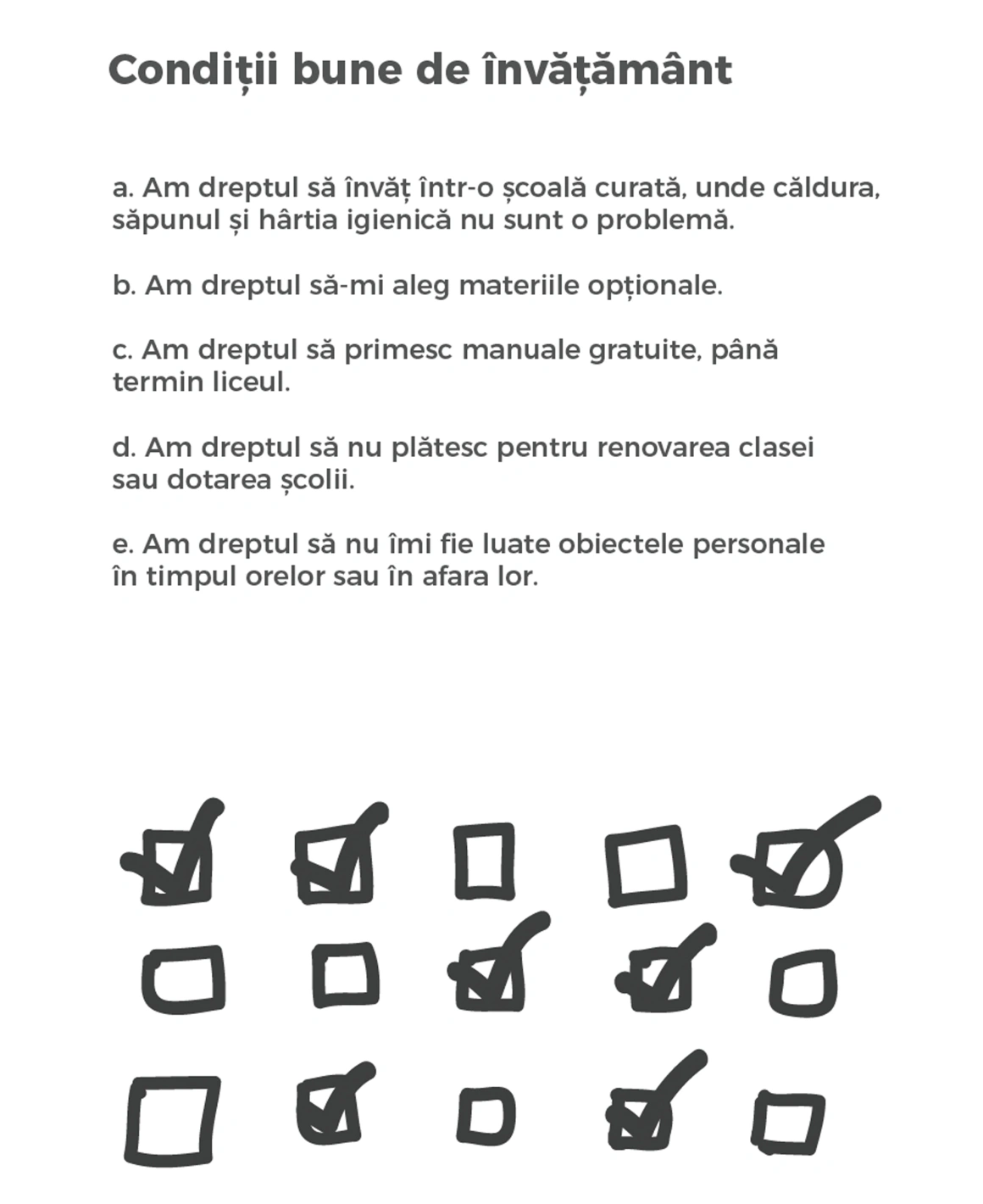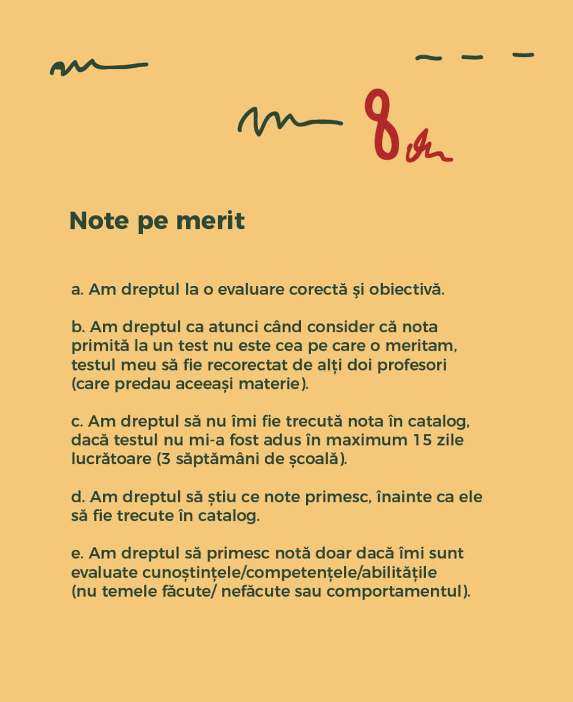 Numai că, spune Diana Filimon de la Forum Apulum, Statutul nu e scris într-un limbaj accesibil. Doar să-l pui pe perete într-o clasă nu înseamnă că elevii vor și înțelege prevederile. Așa că membrii Consiliului Național al Elevilor l-au „tradus” pe înțelesul tuturor, au testat cu grupuri de elevi toate textele și le-au modificat astfel încât să fie cât mai clare și au avut grijă să includă, pe lângă drepturi și obligații, și cum pot să se facă auziți elevii. Pentru ilustrații, au provocat peste 100 de elevi să povestească grafic diferite capitole din Ghid și au primit desene de la aproximativ 50. George Roșu le-a selectat pe cele mai potrivite, așezarea în pagină a fost făcută de Emilian Mocanu și tipărirea, în 6300 de exemplare, a fost finanțată de UNICEF.