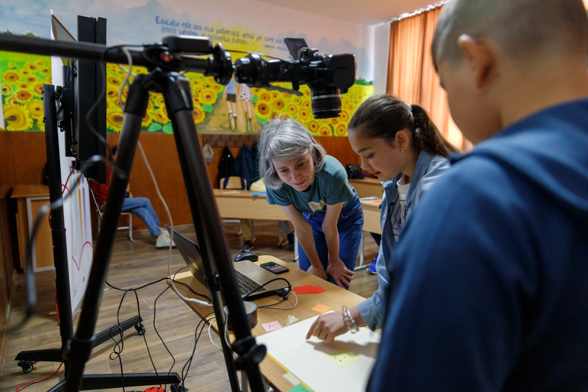 Omizi colorate și nori îmbrățișați, pătrate care joacă fotbal și un robot căruia îi este furat un ochi - sunt câteva dintre poveștile cu care au venit elevii de la școala din satul Malu Spart, jud. Giurgiu, la atelierul ținut de Anna Florea. Ilustratoare și regizoare de animație, artista i-a învățat pe copii cum să-și facă propria narațiune, de la regie și personaje până la montaj. „Animația nu e doar pentru copii, este o tehnică prin care poți să faci orice fel de narațiune”, spune Anna.