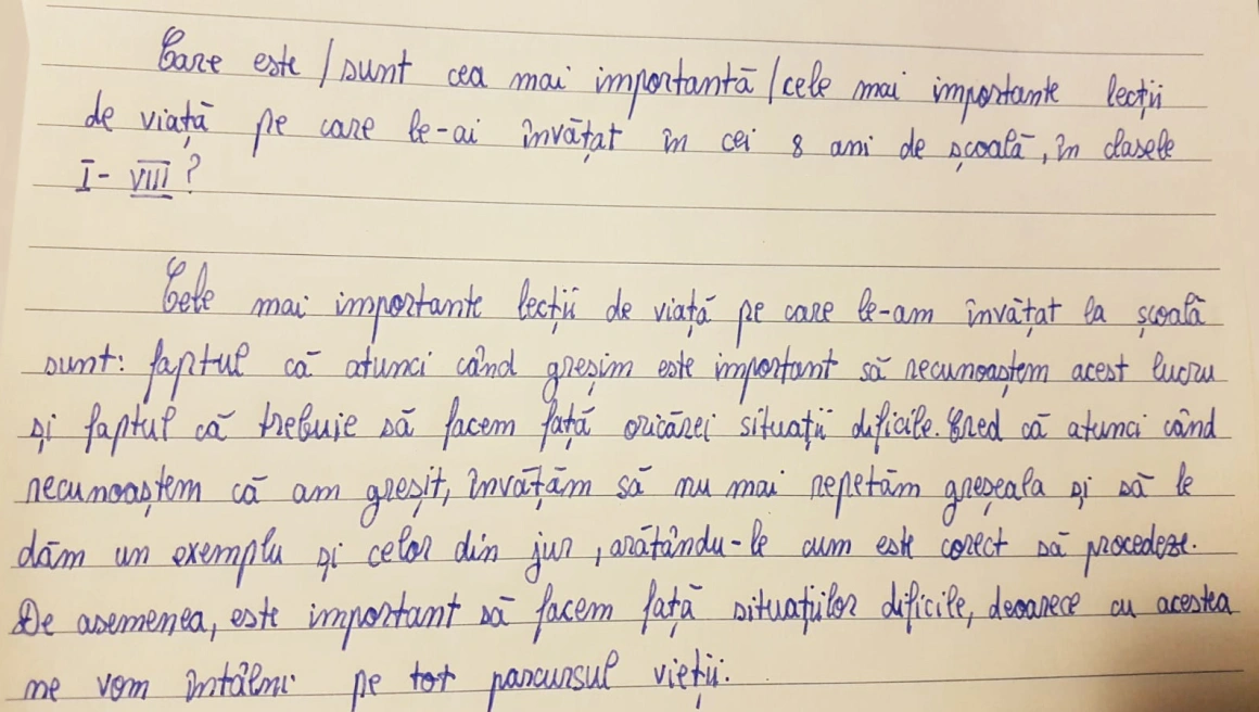 Într-o perioadă în care persoanele cu funcții publice se exprimă frecvent cu greșeli, copiii de clasa a VIII-a spun că în școală au învățat că limba maternă trebuie vorbită corect. Mulți dintre ei scriu și despre ajutorul pe care au învățat să îl ofere celor aflați în situații grele, deși motivațiile lor diferă: unii spun că e bine să ajuți pentru că astfel persoana respectivă se va simți mai bine, iar alții merg pe principiul „bine faci, bine găsești”. Un elev spune că a învățat să răspundă cu bunătate atunci când primește hate pentru că acea persoană s-ar putea schimba.