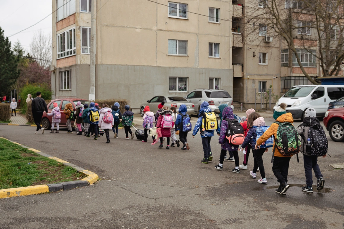 Este ora 10 și zeci de elevi de clasă primară sunt aliniați și conduși de doi profesori. Merg spre sala de sport care se află în apropiere. Au ajuns deja la ultima oră din program. Între timp, autocarul școlar aduce șase elevi care încep orele de la 10.10. Vor termina nici patru ore mai târziu, la 13.50.