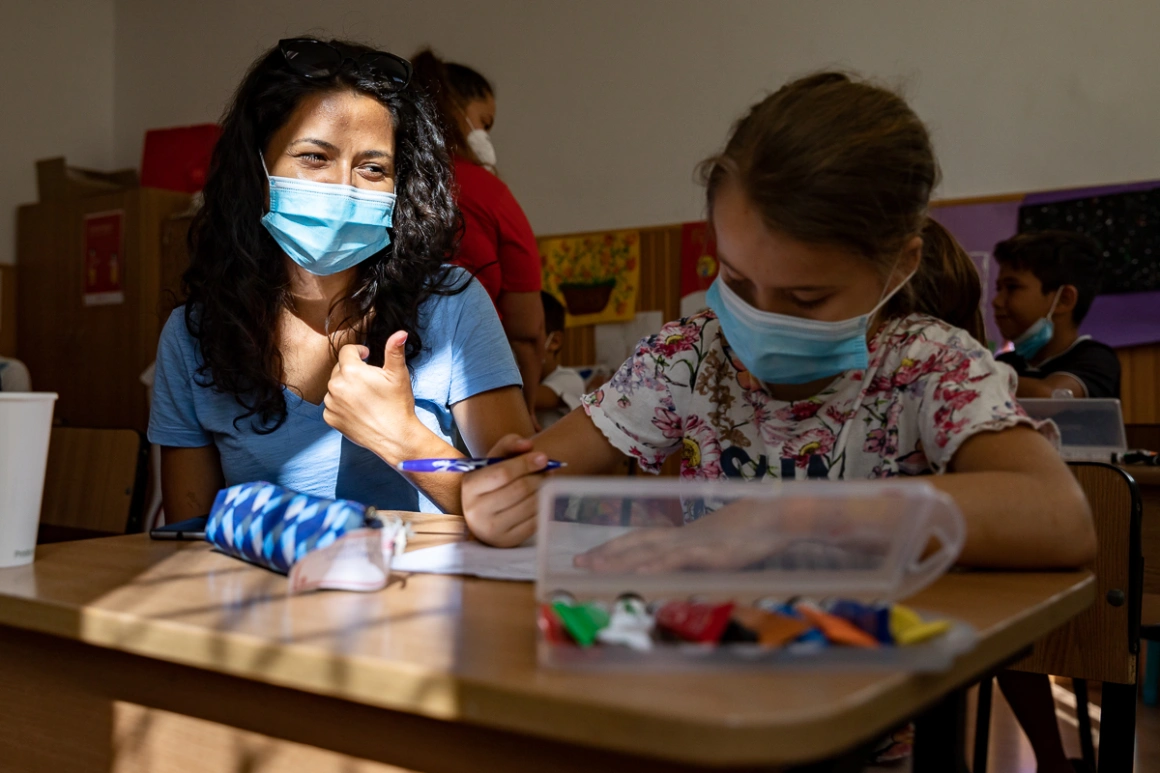În ultima bancă de lângă ferestre, Maria Fățoi, o voluntară a ONG-ului, face câte un nod pe fiecare dintre cele două șnururi ale măștii unui copil, ca să nu-i mai cadă de pe față. Pe băiat îl cheamă Ricardo Său, are nouă ani, iar anul acesta intră în clasa a III-a. În timp ce Maria îi așază masca, copilul se uită în sus către boxa de unde se aude muzica. Când este fotografiat, puștiul arată semnul „peace“ (n.r. - pace), așa cum fac rapperii de peste Ocean.