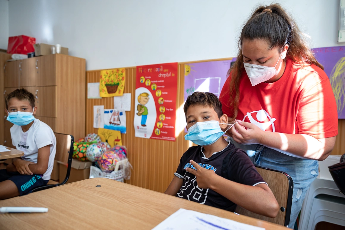Foto: Maria Fățoi, unul dintre voluntarii Salvați Copiii, îi aranjază masca lui Ricardo Său. În stânga, este fratele său Antonio