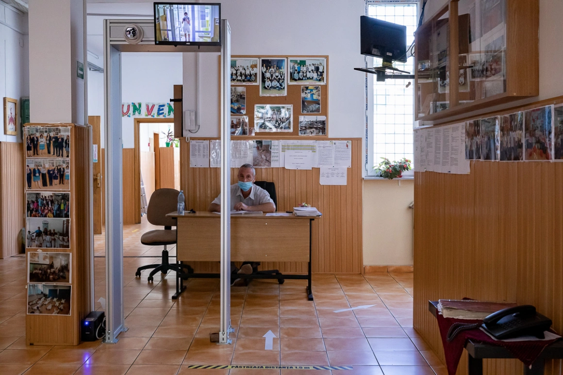 Ca să ajungi în clasa unde se află grupa mijlocie, unde vin copii între 8 și 11 ani din cadrul programului, trebuie să fii scanat de termometrul digital de la intrare - care îți afișează pe ecran temperatura corpului. Apoi, treci printre două bare înalte de metal, ca cele de la intrarea într-un tribunal sau în Casa Poporului.