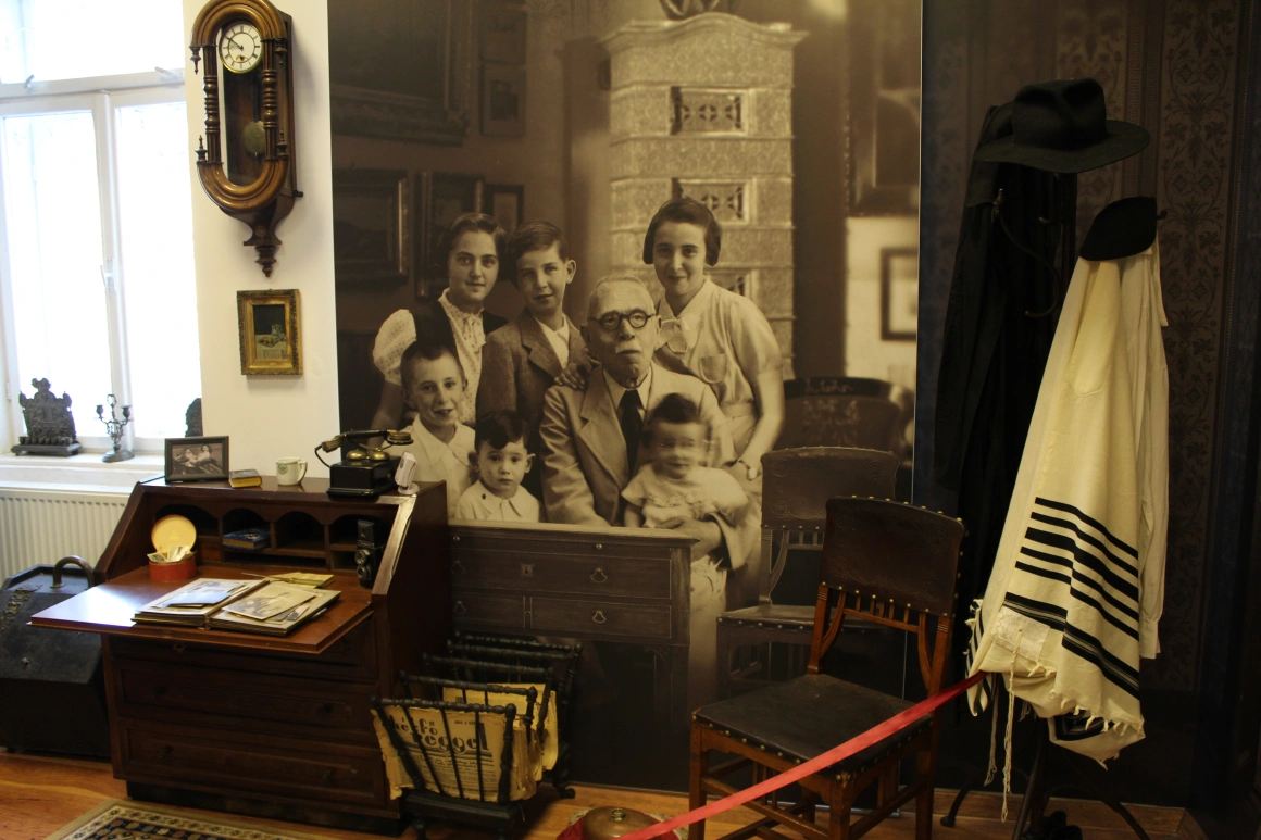 În prima încăpere a Muzeului Evreilor din Târgu Mureș poți să vezi reproducerea unei locuințe tipice pentru o familie puțin mai înstărită de la începutul anilor 1900. Deasupra ei stă scris „În sânul familiei”. Vasile Dub, liderul Comunității Evreilor din Târgu Mureș subliniază în română, maghiară și engleză pentru vizitatorii care-i calcă pragul, arătând spre ziarele stivuite lângă un birou, că această familie tipică citea presă de limbă maghiară. Ar putea să spună aceeași poveste și în limba franceză.