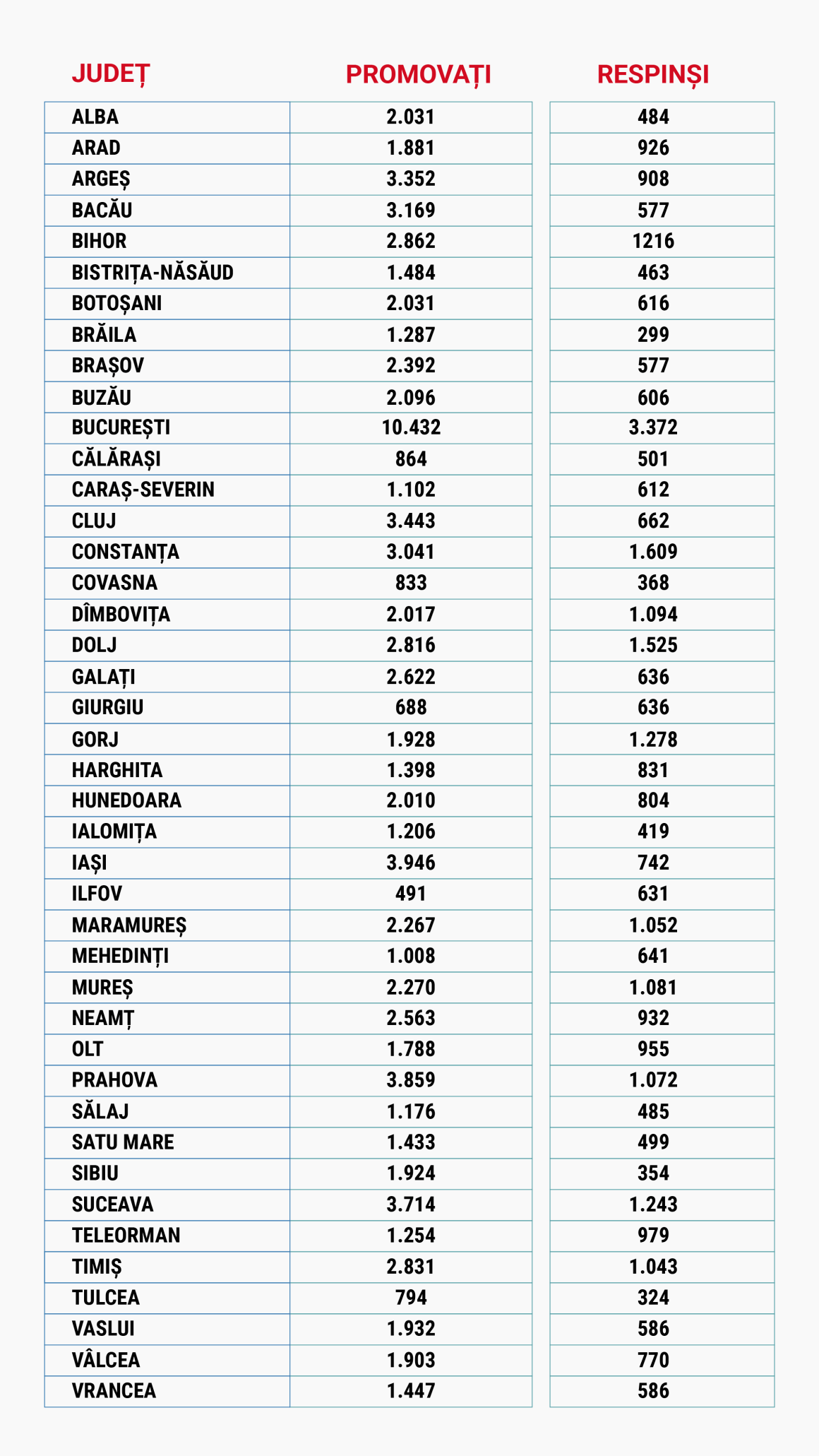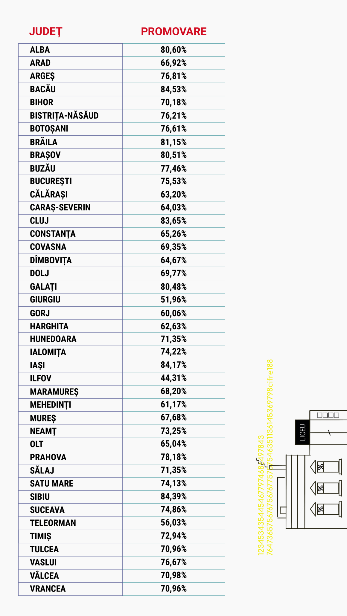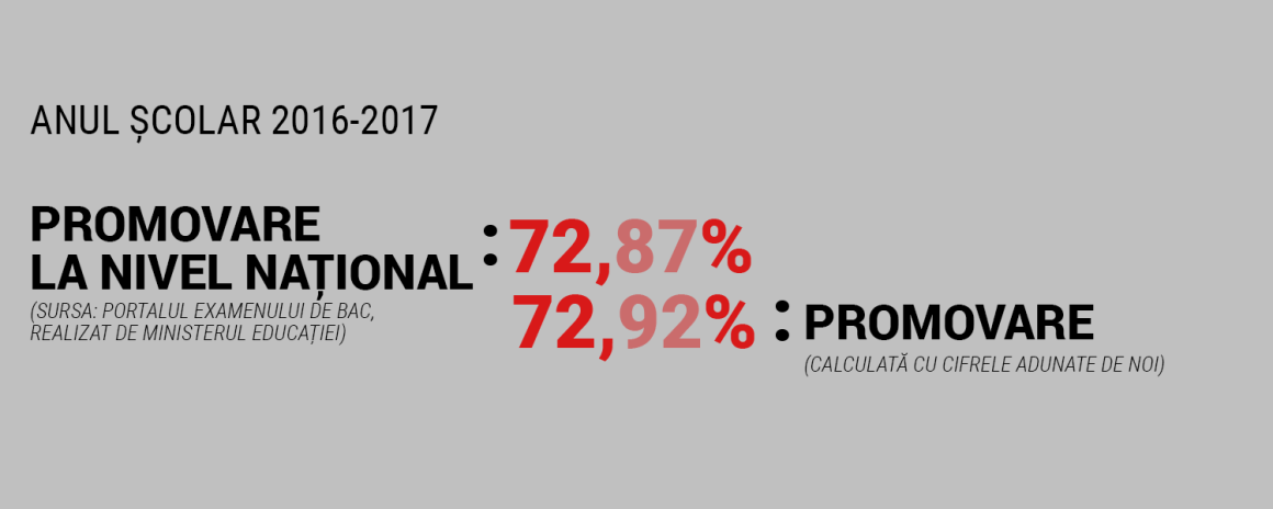 *Datele au fost colectate din rapoartele județene privind starea învățământului pentru anul școlar 2016-2017, respectiv de pe portalul examenului de Bac, realizat de Ministerul Educației, pentru județele unde rapoartele nu au fost făcute publice. Între procentele de promovare comunicate de minister și cele calculate de noi există diferențe de ordin zecimal, probabil din cauza actualizării unor date pe site-urile locale.