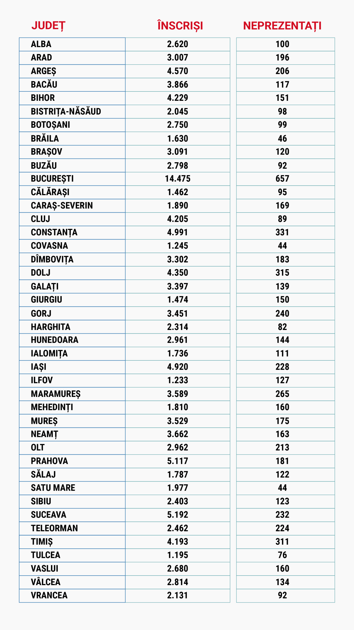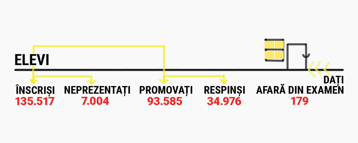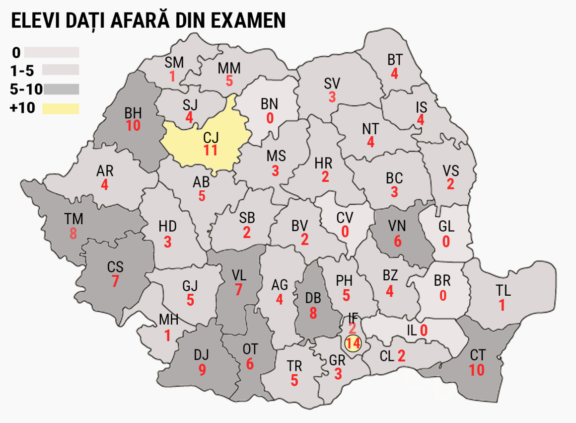 În 2011, când examenul de Bacalaureat s-a desfășurat pentru prima oară sub supravegherea camerelor video, rata de promovare a scăzut drastic, de la 69,3% cu un an înainte, la 45,73%. În 2012, procentul elevilor care au promovat Bacul a fost de 44,41. Însă, din 2013, cifrele au fost tot mai bune, iar anul trecut 72,87%* dintre cei care au susținut „examenul maturității” l-au și promovat. Bacău, Sibiu și Iași au fost județele cu cel mai mare procent al elevilor reușiți, de peste 84, iar în București găsim cei mai mulți elevi care au promovat Bacalaureatul cu media 10, în contextul în care capitala este și lider la numărul elevilor înscriși să susțină examenul. Pentru a înțelege însă mai bine unde se află fiecare județ în parte este necesară o privire de ansamblu asupra statisticilor: câți elevi au încercat să fraudeze examenul? Câți dintre absolvenți nu s-au prezentat? De unde provin cei mai mulți elevi care au picat examenul?
