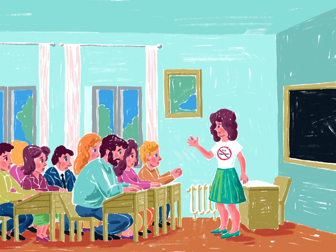 Ruxandra Mercea este directoarea școlii, are 34 de ani și poartă un tricou ilustrat cu un cerc tăiat, în centrul căruia scrie old paradigms. „Dacă vrei niște schimbare, lucrează la comportament”, spune ea, „dacă vrei schimbare majoră, lucrează la paradigme.” Despre părăsirea paradigmelor vechi de gândire – care spun, de exemplu, că numai notele contează sau că lideri pot fi doar câțiva – le va vorbi și părinților; despre asta este, de fapt, tot procesul de lucru pe care școala s-a concentrat acum un an, când a angajat full-time cinci psihoterapeuți sau well-being advisors, cum sunt cunoscuți în școală.