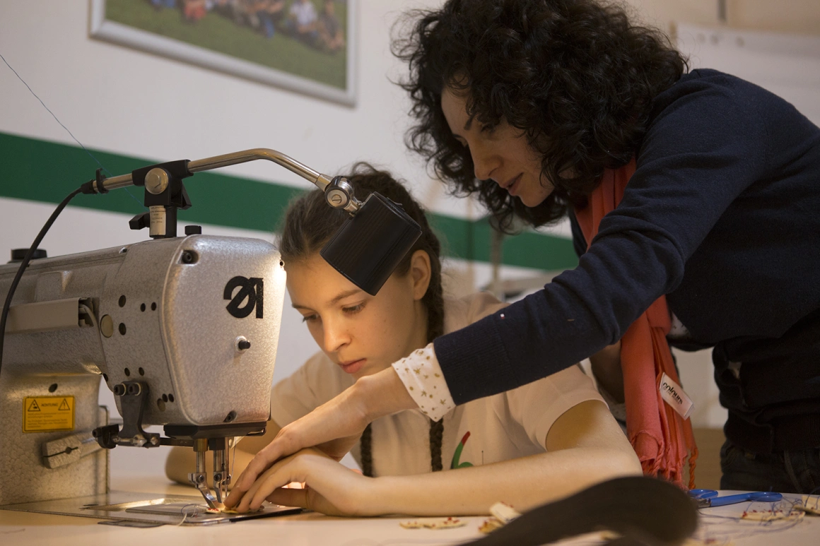 Adriana Cioloca e profesoară de confecții piele. În timp ce lucrează cu elevii la niște mărțișoare pentru o acțiune caritabilă, ea povestește că a plecat din fabrica parteneră a școlii pentru a veni aici. Și-a dat toate examenele. Într-un mod pragmatic, asemeni întregului proiect, ea oferă un răspuns simplu pentru motivele transferului: „Mai e bine să schimbăm și joburile”.