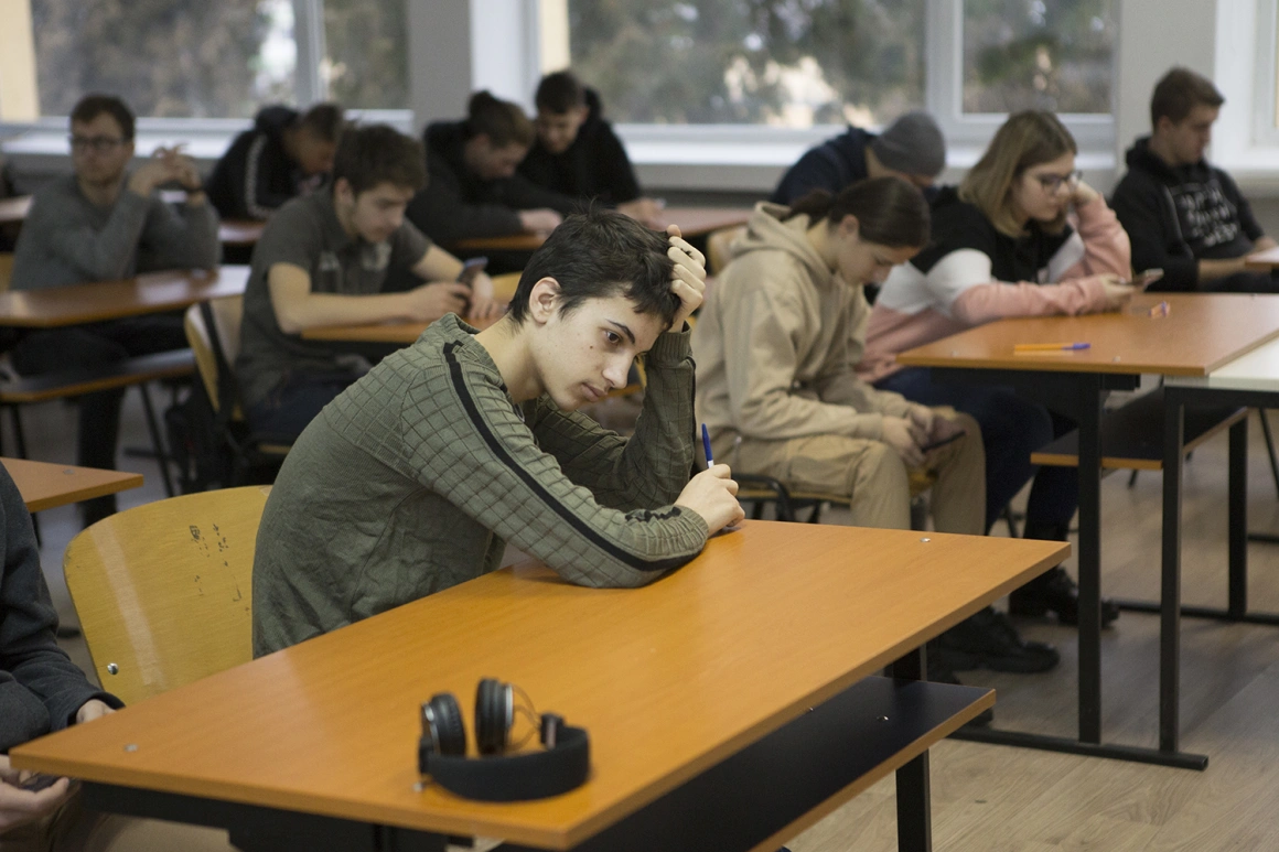 Vreo 20 de elevi s-au adunat în clasa în care vor susține olimpiada de engleză pe școală. Daniel s-a așezat într-o bancă din față. Așteaptă gânditor ținându-și capul sprijinit într-o mână, iar în cealaltă are un pix albastru. Mihai e mai în spate. Prevăzător, și-a pus trei pixuri pe masă. Mai aruncă o privire pe telefon la acestea. Alți colegi se joacă pe mobil, iar nelipsitul grup din ultimele bănci se ține de șagă.