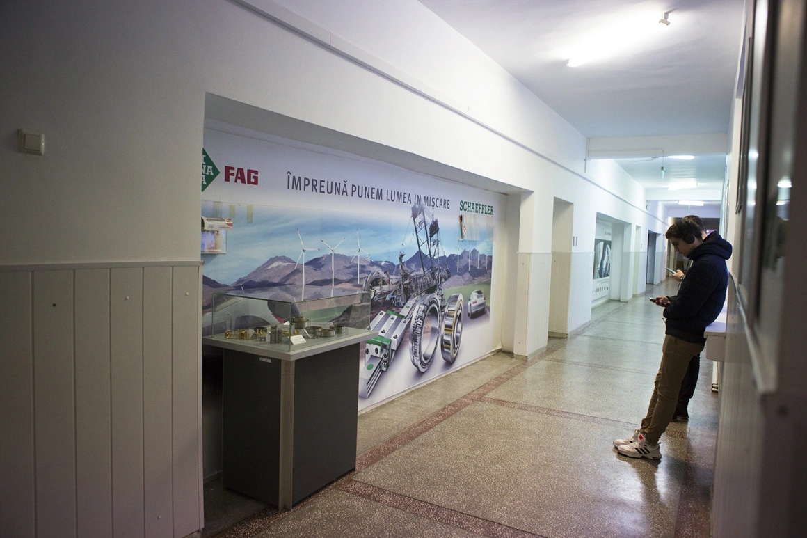 E liniște pe culoarele școlii cu vitrine în care sunt expuse piese ale firmelor partenere. Doar din clase mai răzbat voci ale profesorilor care predau. Machete de mașini scumpe ca Audi, Mercedes sau BMW, componente de uși auto, „organe” de mașini cu nume ciudate ca „suport ABS injectat” care arată ca un cub negru în care a fost săpat în mijloc un canal în formă de față zâmbitoare, rulmenți mari sau mici indică în ce sectoare ale industriei vor lucra absolvenții.