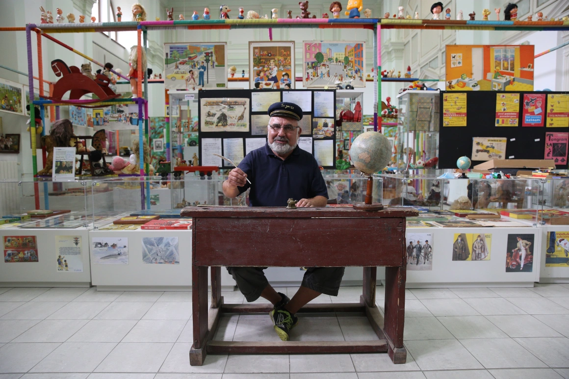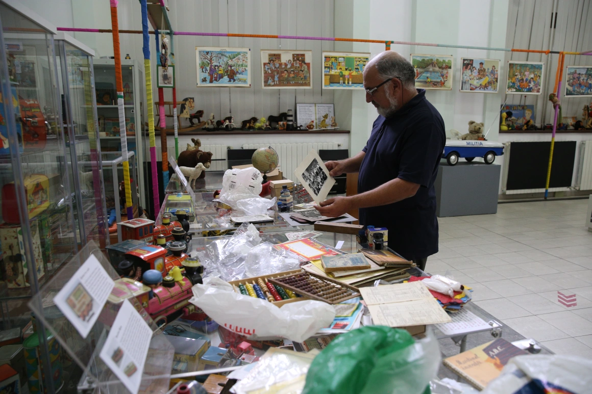 Ascuțitori de toate formele, cretă colorată și albă, stilouri, călimări care mai de care mai fanteziste. Le scoate din zeci de cutii și le prezintă. Muzeului jucăriilor devine repede un târg de duminică.