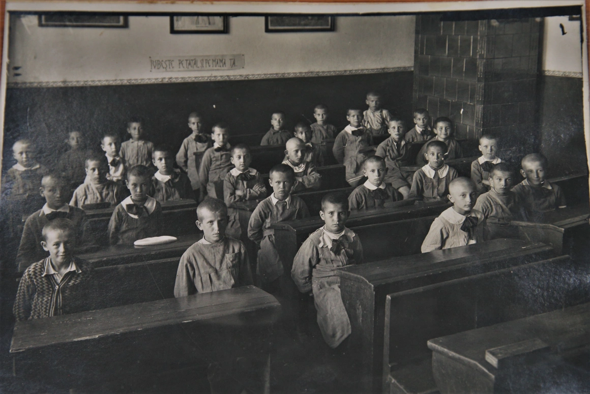 Scoate din pungi fotografii vechi. Într-o fotografie cu aproape 30 de băieți îmbrăcați toți în sarafane, numărăm doar trei zâmbete. Pe peretele din spatele lor scrie „Iubește pe tatăl și pe mama ta”.