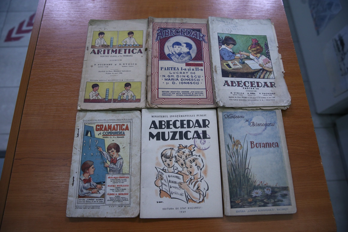 Numărători colorate din lemn, ascuțitori sub formă de clovni, ventilatoare, bețigașe. Abecedare. „Politica începea cu abecedarul. Întotdeauna, prima pagină era conducătorul țării, am prins și noi în comunism cu Tovarășu, dar erau și Regele Mihai, Carol, Ferdinand. Abecedarul începea întotdeauna cu conducătorul țării. Interesante sunt și în ani 20-30, când era manualul unic, un manual care cuprindea atât limba română, cât și istoria, cât și geografia”, trece prin istoria manualelor.