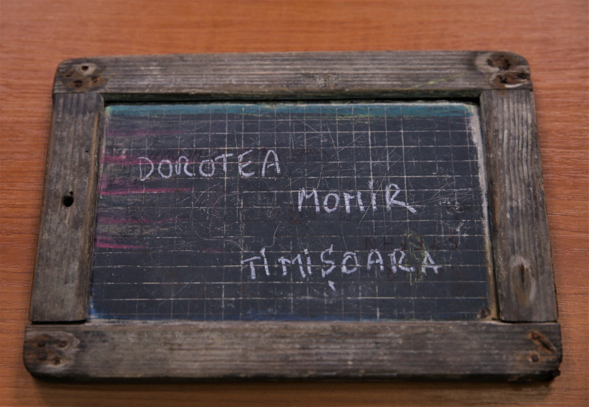 Întoarcem pe toate părțile o plăcuță neagră, zgâriată, cu ramă de lemn vechi. „E o tabletă de ardezie, se scria pe ea cu tibișir, un fel de minicretă subțirică.