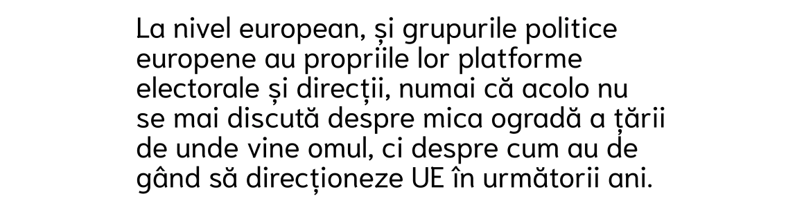 Cum arată listele pentru europarlamentare: partidele politice din fiecare țară care se consideră puternice pentru PE își fac aceste candidaturi și noi îi alegem la nivel național, dar ei nu se duc acolo și devin grupul parlamentarilor români. Fac parte din grupuri politice la nivel european, care au la rândul lor principii, direcții de acțiune și priorități, ceea ce ne face nouă sarcina dificilă ca alegători, pentru că nu ne putem uita, cred eu, doar la ce spun ei la nivel național. Ne interesează și ce vor face odată ce ajung acolo. Care e platforma voastră, ce aveți de gând să faceți la nivel european? Cu cine vă aliniați în priorități, principii și valori?