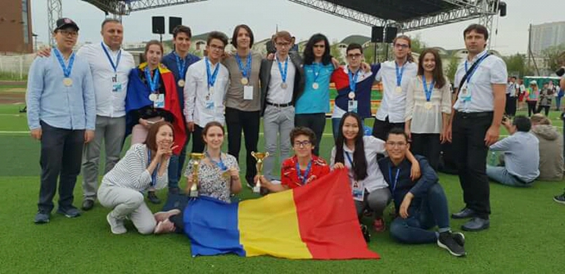 Foto: Lotul național de chimie, la olimpiada Tuymaada, în 2018. Ana Florescu este pe rândul de jos, ținând tricolorul