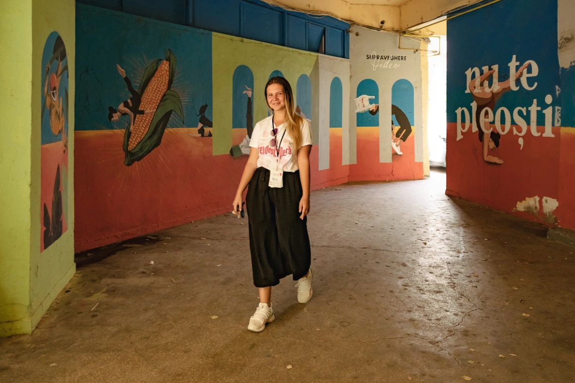 Pentru că a urmat cursurile online, tânăra n-a apucat să se desprindă cu adevărat de localitatea în care a crescut. Ajungem într-un gang cu pereți pictați de voluntarii Ideo Ideis. „Nu te pleoști”, scrie alb pe albastru. E un culoar cu mesaje și acrobați pe care-l străbat zilnic o mulțime de oameni. „Trec des pe aici, sunt magazine, farmacii… Din cartiere, oamenii vin în centru”, mai spune Anca.