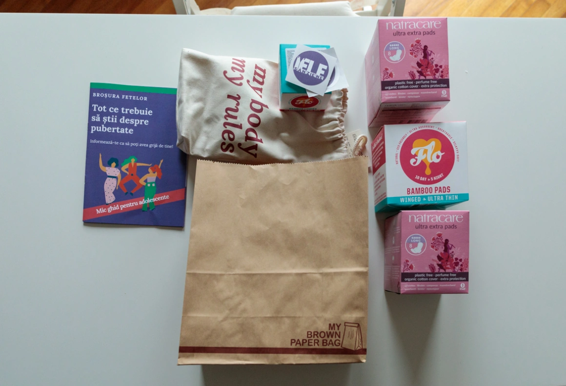 Foto: Pachetul pe care asociația Iele Sânziene îl oferă fetelor la finalul atelierelor: tampoane, absorbante biodegradabile și reutilizabile, o broșură și stickere